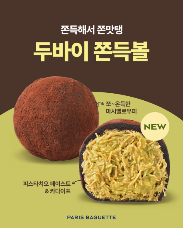 업계에 따르면 파리바게뜨는 최근 '두바이 쫀득볼'을 출시했습니다. 해당 제품은 파리바게뜨 양재 본점, 판교 랩오브 파리바게뜨점, 광화문 1945점 등 일부 직영점에서 한정 판매됩니다.