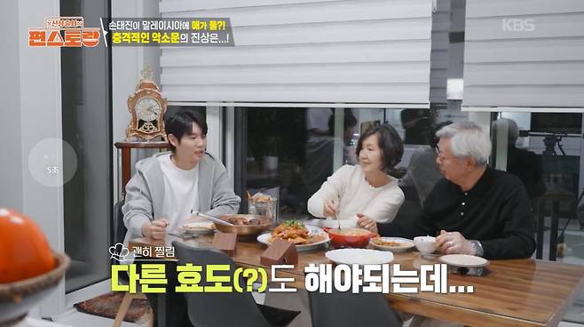 손태진은 부모님을 위해 칠리크랩, 갈비찜, 마파두부 등 요리를 만들었다. 오랜만에 세 식구는 밥상 앞에 모여 식사하며 담소를 나눴다.
