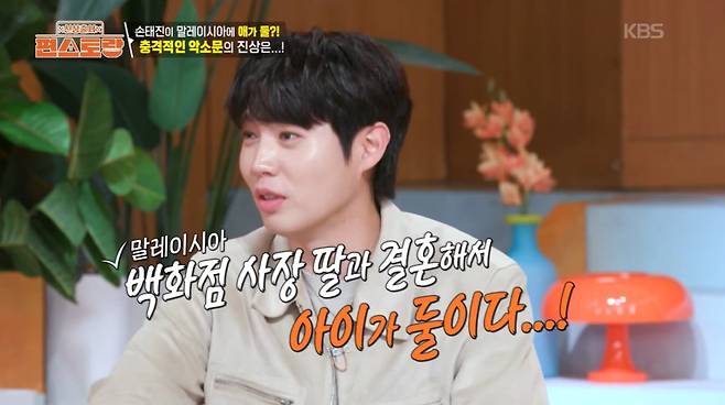 손태진은 "말레이시아 백화점 사장 딸과 결혼해 애가 둘이라더라"며 "부모님이 말레이시아에 사셨다. 사이사이에 사실을 섞으니 사람들이 가짜뉴스를 믿더라"고 토로했다.