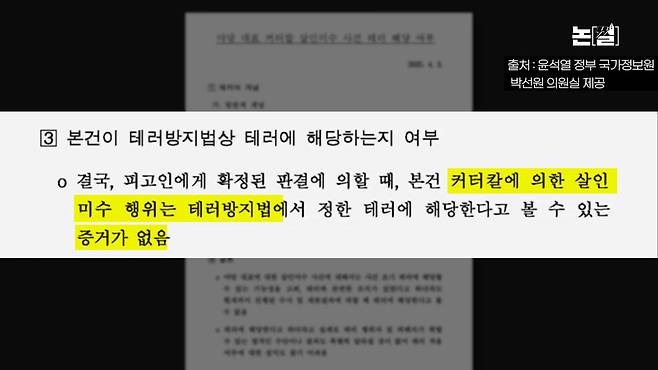 그런데 윤석열 정부 국가정보원은 범행에 사용된 흉기가 ‘커터칼’이라며 테러방지법의 ‘테러’에 해당하지 않는다고 정리했습니다. 마치 문구용 커터칼에 살짝 긁힌 상처인 것처럼 축소했습니다.