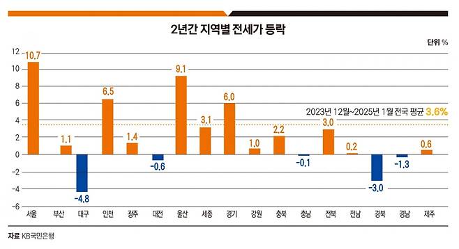 전세 계약 주기인 2년 전에 비해 서울(10.7%), 울산(9.1%), 인천(6.5%), 경기(6.0%)는 5% 이상 상승하여 전세난이라고 할 수 있다. 이들 지역에서는 기존 세입자들이 계약갱신청구권을 사용하면 5% 이내의 인상만 할 수 있기 때문에 가능한 한 기존 집에서 재계약을 하기 원한다.