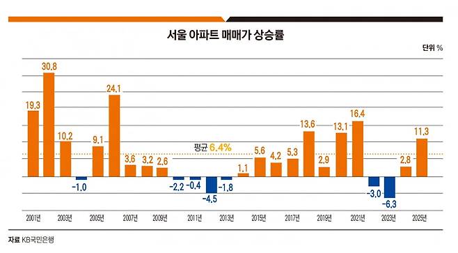하지만 이는 평균의 착시이다. 전국 아파트 매매가 상승률은 1.22%에 그쳤지만 서울 지역만 놓고 보면 2025년의 상승률은 11.26%로 그 어느 해보다도 뜨거운 한 해를 보냈기 때문이다. 서울 지역의 상승률은 지난 25년 평균 상승률 6.39%에 비해 거의 두 배 가까운 상승세를 보였던 것이다.