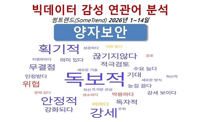 빅데이터 심층 분석 도구인 썸트렌드(SomeTrend)로 지난 1월 1일부터 14일까지 양자보안에 대한 빅데이터 감성 연관어를 도출했을 때도 그런 흐름이 명확하게 드러났다. 분석에서 가장 핵심에 위치한 단어는 ‘독보적’이라는 세 글자다. 그 주변으로 ‘강세’, ‘안정적’, ‘무결점’, ‘기대’, ‘강화된다’와 같은 표현이 밀집돼 있다.