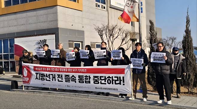 | ▲ 지난 14일 충남 시민사회단체연대회의가 긴급 기자회견을 열고 대전충남행정 통합 논의 중단을 촉구했다. |