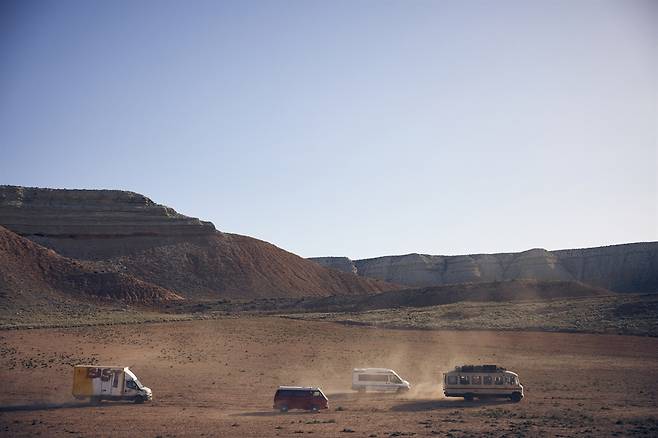 그러나 사막의 여정은 유럽 사회에 익숙한 아버지와 아들이 상상한 수준을 가뿐히 뛰어넘는다. 일행이 염려한 대로 유럽 캠핑에나 통용될 부자의 밴은 도로는커녕, 그야말로 산 넘고 물 건너야 하는 황무지에서 거듭 멈추고, 인적이라곤 찾을 길 없다. 베테랑 여행자인 동료들도 점점 순식간에 뒤바뀌는 상황 앞에 점점 무력화된다. 마치 사막이 그들을 일종의 미로로 빨아들인 것 같은 오싹한 기분이 들 정도다. 레이버들이 향하려던 비밀 파티 장소가 과연 실재하는지 의심할 수밖에 없다.