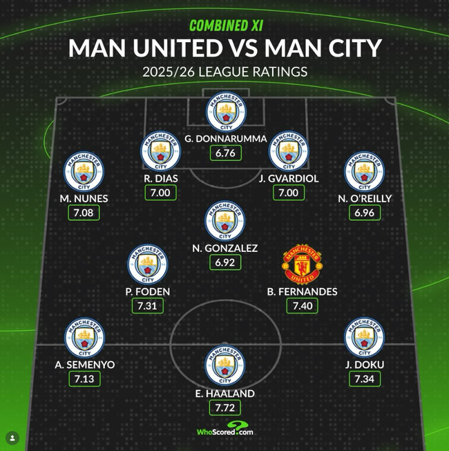 맨유에서는 '캡틴' 브루노 페르난데스가 7.40점을 받으며 통합 베스트11에 포함됐고, 나머지는 다 맨시티 선수였다.