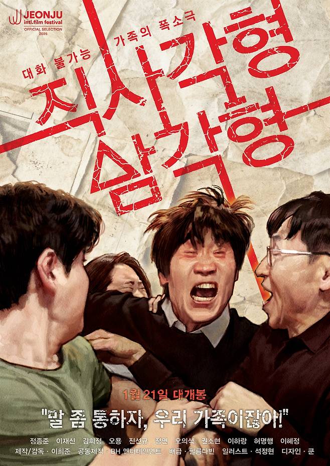 관습적 드라마라면 한바탕 싸우다 적당히 봉합 혹은 화해로 흘러가게 마련이다. '막장' 드라마 문법과 <직사각형, 삼각형>은 그 흐름이 중반까진 유사하게 보이지만, 후반부에서 차이를 드러낸다. 영화는 점입가경 난장판을 펼치며 이를 풍자 무대로 활용, 관객 각자가 성찰할 수 있도록 유도한다.
