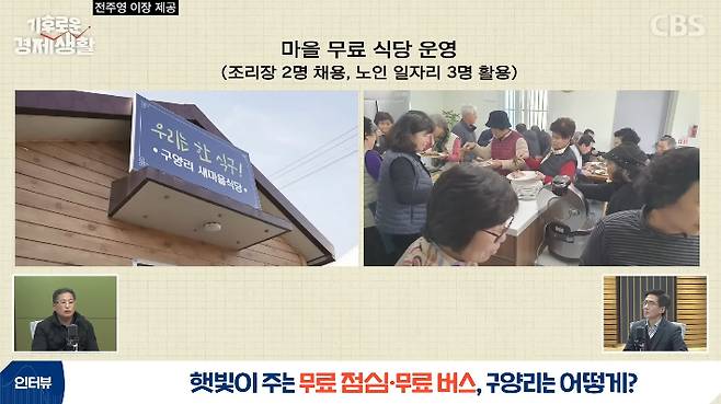 ◇ 전주영> 우선은 사무장을 저희가 고용하고 있거든요. 그래서 사무장 인건비가 나가는 게 있고. 그다음에 마을 미니버스를 무료로 운영하고 있습니다. 사무장이 운전을 하죠. 그리고 저희가 마을 식당은 조리장님을 고용해서 운영하고 있습니다.