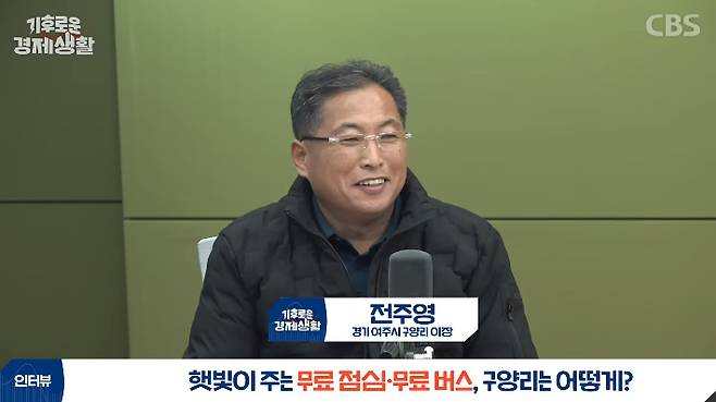 ◆ 홍종호> 안녕하세요. CBS 경제연구실입니다. 저는 기후의 눈으로 경제를 읽는 기후로운 경제생활 홍종호입니다. 경기도 여주시에는 매달 태양광 발전으로 1천만 원을 벌어 무료 점심과 무료 버스를 운영하는 마을이 있습니다. 정부에서도 주목한 햇빛 소득 마을 구양리인데요. 처음엔 내가 20년은 더 살겠나, 라며 태양광 설치를 반대하던 주민들께서도 지금은 한 식구가 되었다고 합니다. 오늘은 구양리의 마을 태양광 사업을 이끌어 오신 전주영 이장님에게 햇빛이 농촌을 살리는 비법 직접 들어보겠습니다. 그럼, 잠시 후에 뵙겠습니다.