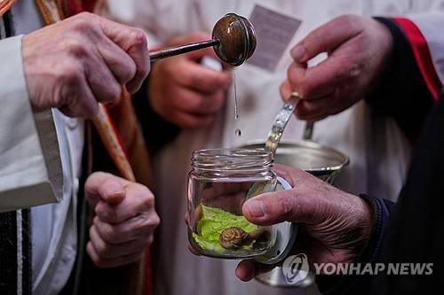 A priest sprinkles holy water on a pet snail during a blessing of the animals service marking the feast of Saint Anthony, at the San Anton church in Madrid, Spain, Saturday, Jan 17, 2026. (AP Photo/Manu Fernandez)