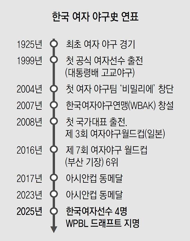 국내에 야구가 전해진 때는 미국인 선교사 필립 질레트가 당시 황성기독교청년회(YMCA) 회원들에게 야구를 가르친 1904년. 국내 최초 야구 경기가 열린 건 2년 뒤인 1906년이다. 초창기 선수들은 고의적삼을 입고 짚신을 끈으로 매어 신고 경기했다. 외야수는 맨손으로 공을 잡고 방망이는 단 한 개를 두 팀이 번갈아 썼다. 그러나 1930년대에 이르러서는 선수들이 ‘유니폼 입고 스파이크 신고’ 출전했다. 이때 신문에서 짚신 신고 경기했던 초창기 모습을 이미 “상상할래야 상상할 수 없는 ‘호랑이 담배 먹던 시절’일이다”고 한 걸로 보아 야구 여건이 크게 개선됐음을 알 수 있다. 야구는 1960∼1970년대 열광적인 고교야구 인기 시대를 지나 1982년 프로야구가 출범하며 폭발적으로 성장했다. 하지만 남자 중심이었다. 여자 쪽에는 선수도 팀도 없었다.