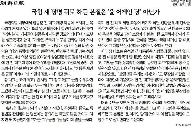 조선일보는 1월16일 치 신문에 “국힘 새 당명 뭐로 하든 본질은 ‘윤 어게인 당’ 아닌가”라는 제목의 사설을 실었습니다. 제목이 하도 강렬해서 어느 신문인지 다시 한 번 확인하고 내용을 읽었습니다.