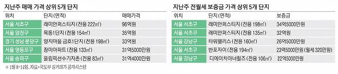 전월세 보증금이 가장 높았던 곳도 서초구 래미안퍼스티지 전용 198㎡(34억5000만원)였다.