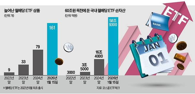 18일 코스콤 ETF체크에 따르면 이날 기준 국내 161개 월 배당 ETF의 순자산 총액은 약 58조9300억원에 달한다. 이달 초 대비 1조원 늘었고, 2024년 말 대비로는 약 3.6배로 급증했다. 계좌별 공식 통계는 없지만 연금저축, 퇴직연금 등 연금 계좌 자금이 많이 유입됐다는 게 금융투자업계의 분석이다.