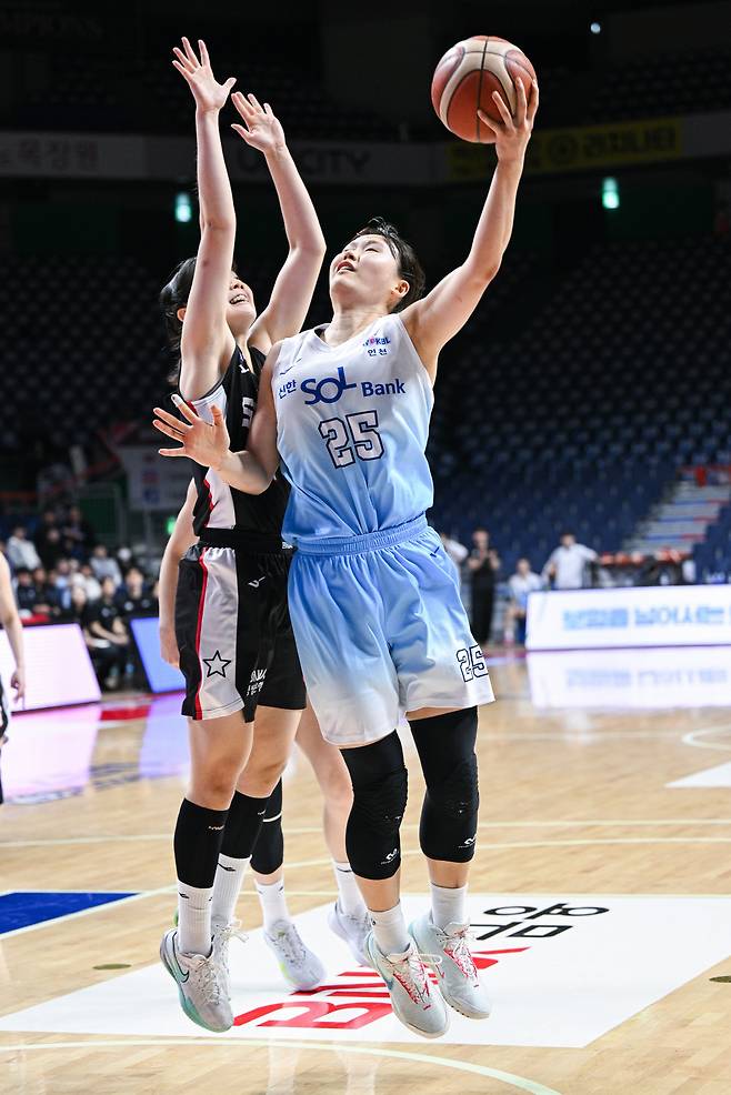 [스포츠조선 최만식 기자] 여자프로농구 인천 신한은행이 천신만고 끝에 연패 수렁 탈출에 성공했다. 신한은행은 18일 부산 사직체육관에서 열린 'BNK금융 2025~2026 여자프로농구' 정규리그 부산 BNK와의 원정경기서 2차 연장 혈투 끝에 85대79로 승리했다.
