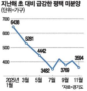 18일 경기도에 따르면 지난해 11월 기준 평택시의 미분양 주택은 3594가구로 전달(4067가구) 대비 11.6% 감소했다. 같은 해 1월(6438가구)과 비교하면 약 1년 만에 44.2% 급감했다.