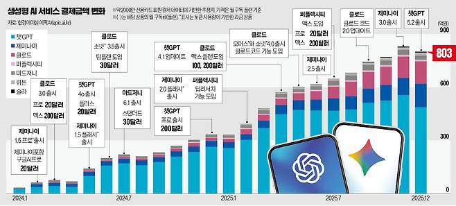 오픈AI의 챗GPT와 구글 제미나이 등 주요 7개 서비스의 내국인 결제금액(추정치)은 작년 12월 803억원이었다. 2024년 1월 34억원에서 2년 만에 2361% 급증해 넷플릭스서비시스코리아의 2024년 월평균 구독료(750억원)를 넘어섰다. 연간반복매출(ARR)로 환산하면 9636억원에 달한다.