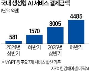 이용자 확산 속도는 주요국 가운데 가장 빠른 것으로 나타났다. 마이크로소프트 싱크탱크인 AI이코노미인스티튜트의 최근 조사를 보면 국내에서 생성형 AI를 한 번 이상 사용한 생산가능인구 비중은 작년 하반기 30.7%였다. 상반기(25.9%) 대비 4.8%포인트 증가한 수치로 조사 대상 30개국 중 증가 속도 1위를 기록했다. 한경에이셀이 집계한 서비스 결제금액은 작년 상반기 3005억원에서 하반기 4485억원으로 49.3% 급증했다.