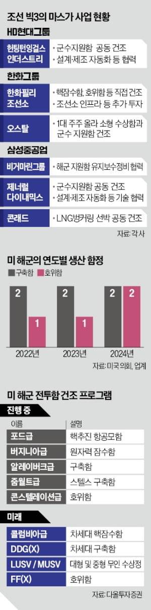 한·미 군함 공동 건조 프로젝트의 맨 앞에 선 회사는 HD현대와 헌팅턴잉걸스다. 두 회사는 미 해군이 발주하는 차세대 군수지원함 개념 설계 입찰에 공동 참여하기로 했다. 업계에서는 항공모함, 순양함, 구축함 등 전투함 기술 관련 세계 최고 기업(헌팅턴잉걸스)과 선박 건조 분야 세계 최강 기업(HD현대중공업) 간 결합이라는 점에서 수주 가능성이 높다고 분석했다.
