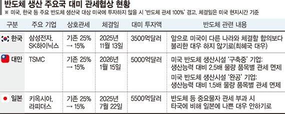 한편 미국이 대만처럼 한국 기업에도 면세 조건으로 공장 신설을 요구할지는 알 수 없다. 트럼프 정부 관계자는 16일 한국 매체를 통해 대만과 합의를 한국에도 적용하느냐는 질문에 "국가별로 별도의 합의"를 한다고 답했다.