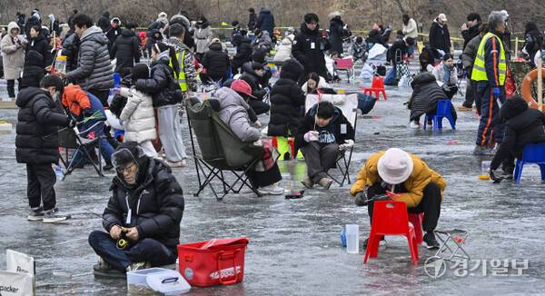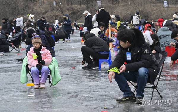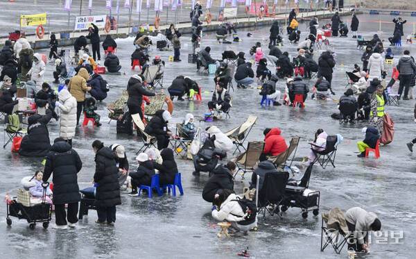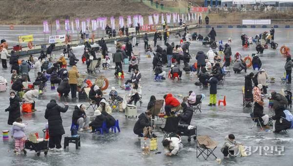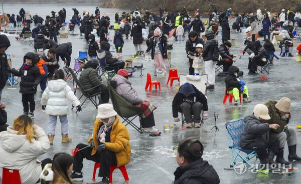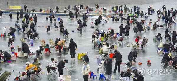 18일 안성시 죽산면 광혜원저수지 일대에서 열린 '웰컴투 동막골 안성빙어축제'에서 행사장을 찾은 관광객들이 삼삼오오 모여 빙어 낚시를 즐기고 있다.