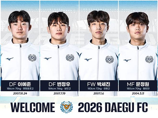 변정우, 이예준, 문정원, 박세진은 동계 전지훈련에 합류해 프로 무대 적응에 최선을 다하고 있으며 대구의 K리그1 승격 도전을 뒷받침할 소중한 자원으로 자리매김할 전망이다.