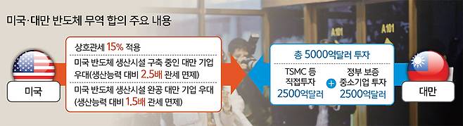 대만 반도체 기업 등의 대미 5000억달러 투자를 고리로 미국과 대만의 관세 협상이 타결되면서 우리 정부와 반도체 업계가 긴장하고 있다. 조만간 미국과 마주할 반도체 관세 협상 테이블에서 도널드 트럼프 행정부가 ‘대만 모델’을 내세워 감당하기 어려운 투자 압박 청구서를 내밀 수 있기 때문이다.