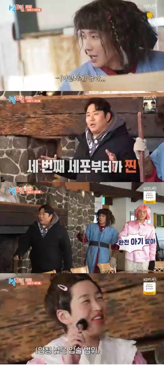 이날 문세윤을 제외한 멤버들은 지난주 오프닝 분장을 걸고 펼쳐진 기상미션 '로데오 곶감 먹기'에서 실패하면서 분장을 하고 등장했다.