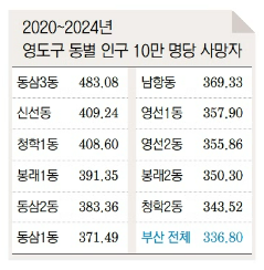 약 20년 전인 2005~2009년에는 부산 평균보다 사망률이 낮은 동이 3곳 있었다. 2015~2019년엔 5곳이나 됐다. 그러나 코로나19 팬데믹이 있던 2020~2024년에 들면서 영도 전역의 사망률이 부산 평균 아래로 떨어졌다. 동별로 최소 7명에서 최대 147명 부산 평균보다 더 많이 사망한다.