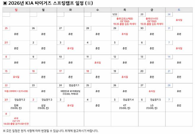 KIA는 오는 23일 출국해 1월 25일부터 3월 8일까지 일본 가고시마현 아마미오시마에 위치한 아마미 카와쇼 구장과 오키나와 킨 구장에서 스프링캠프를 운영한다.