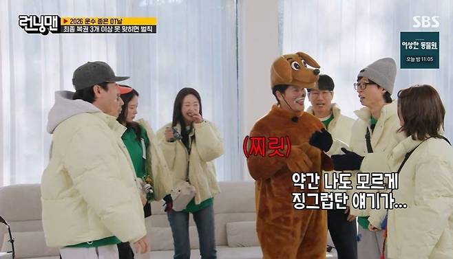 이날 녹화 중에 전화를 받고 사라진 김종국은 뒤이어 개가 되어 나타났다. 충격적인 비주얼에 말을 잇지 못하는 멤버들. 김종국은 배를 까고 눕고 강아지처럼 행동하자 지예은은 "왜 이러는 거야?"라고 크게 당황했다. 유재석은 "나도 모르게 징그럽단 얘기가 나온다"고 밝혔다.
