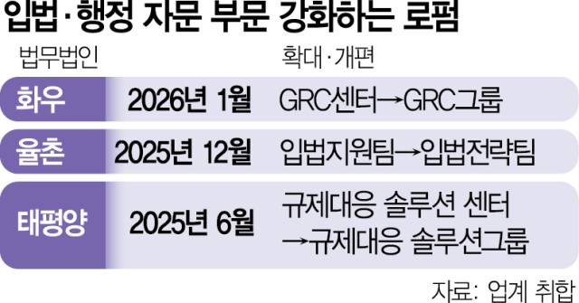 국내 대형 법무법인(로펌)들이 기존 '센터'를 '그룹'으로 한 단계 승격시키는 등 입법·행정 자문 조직 강화에 나섰다.