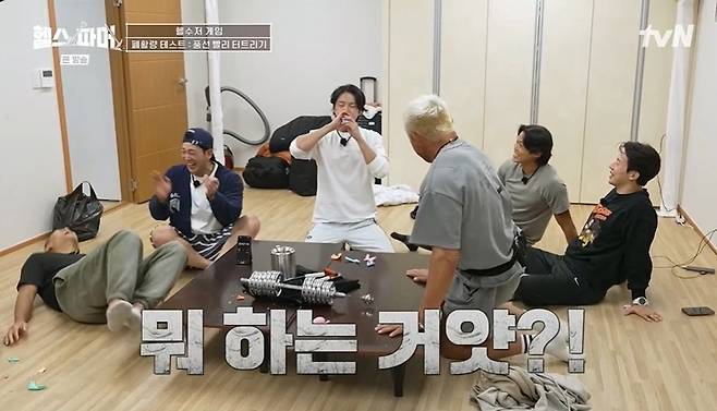 이어 헬수저 게임이 기다리고 있었다. 풍선을 빨리 터트리는 폐활량 테스트로, 첫 번째로 한 백호가 25초를 달성하자 멤버들은 백호만 이기자고 힘을 모았다. 그러다 추성훈은 손을 쓰는 반칙을 했고, "난 안 했다"고 뻔뻔하게 말했다. 충신 허경환은 "전혀 손을 사용하지 않았다"며 추성훈의 편을 들어 웃음을 안겼다. 이어 허경환까지 손을 쓰려고 시도했지만, 뜻대로 되지 않았다.
