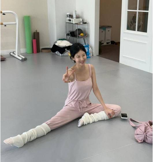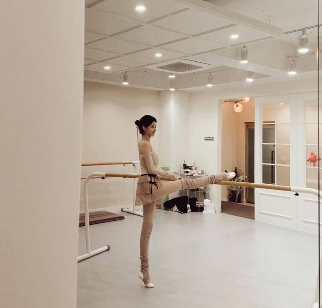 발레 연습실에서 바에 다리를 얹은 채 유연한 느낌을 뽐내고 있는 서현은 완벽한 발레코어를 뽐내고 있었다.