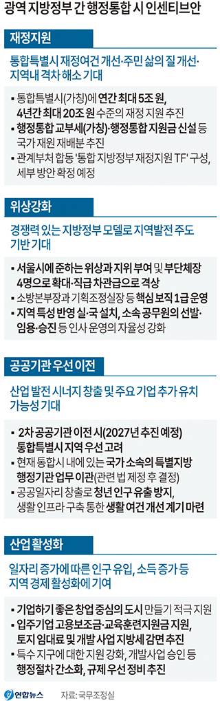 정부가 앞으로 만들어질 '통합특별시(가칭)'에 각각 연간 최대 5조원, 4년간 최대 20조원을 지원한다.