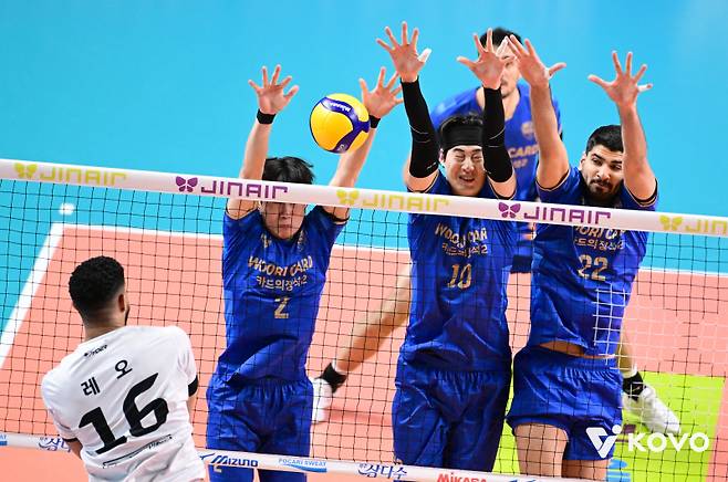 레오가 개인 활약과 팀 승리 모두 웃었다. 레오는 32-30으로 천신만고 끝에 따낸 1세트에만 12득점을 쓸어 담았다. 21-17에선 힘을 빼고 상대의 허를 찌르는 서브 에이스까지 올렸다. 반면 우리카드는 30-31에서 알리의 백어택 공격이 최민호의 블로킹에 막혀 첫 세트를 내준 게 뼈아팠다.