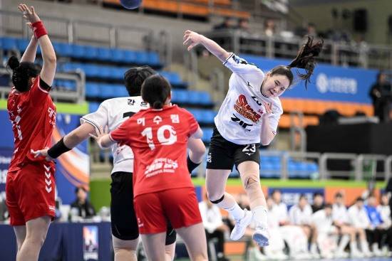 대구광역시청의 슛이 연달아 블록에 걸리면서 SK슈가글라이더즈가 빠른 속공으로 치고 나가면서 24-19, 5골 차로 달아났다.