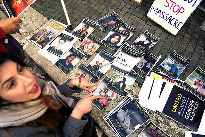 | “이들이 희생된 사람들” 16일 이탈리아 로마에서 이란의 반정부 시위를 지지하는 시민들이 이란 당국의 유혈 진압으로 희생된 시위대의 사진을 공개하며 당국을 규탄하고 있다. 로마=AP 뉴시스 |