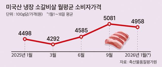 당초 미국산 쇠고기가 무관세로 전환되면 가격이 내려갈 것이란 관측이 많았다. 하지만 실제론 가격이 오히려 10% 넘게 올랐다. 축산물품질평가원에 따르면 이달 1∼16일 미국산 냉장 소갈비살 평균 소비자가격은 100g당 4958원이다. 지난해 1월(4498원)보다 10.2%, 평년 1월(4269원)보다 16.1% 높았다. 1∼16일 1등급 한우 갈비살이 100g당 6625원인 것을 고려하면 미국산 쇠고기값은 한우고기의 75% 수준에 육박했다.