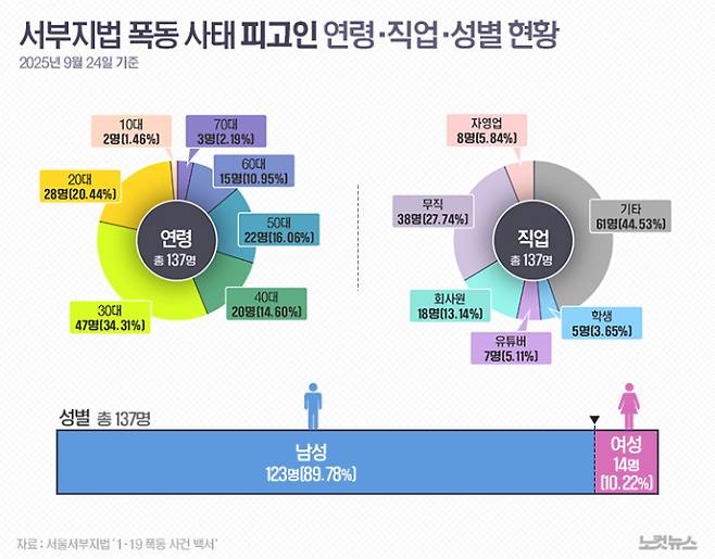 이들을 연령별로 나누면 10대 2명, 20대 28명, 30대 47명, 40대 20명, 50대 22명, 60대 15명, 70대가 3명이다. 30대가 가장 높은 비율을 차지했으며, 20~30대 청년이 전체의 약 55%를 차지했다. 피고인들을 직업별로도 나누면 기타 직업을 가진 61명을 제외하면 무직자가 38명으로 가장 많았고, 회사원이 18명, 자영업자가 8명, 유튜버가 7명, 학생이 5명으로 그 뒤를 따랐다. 또 피고인 중 남성은 123명이고 여성은 14명이었다. 30대 무직 남성인 손씨는 가장 전형적인 피고인의 모습이었다.