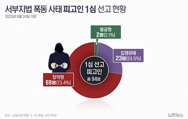 백서에 따르면, 지난해 9월 24일 기준 서부지법 폭동 사태로 기소된 137명 중 1심 선고를 받은 피고인은 총 94명. 그중 징역형은 69명, 징역형의 집행유예는 23명, 벌금형은 2명이었다. 그중 가장 높은 징역 5년을 선고받은 사람은 손씨와 공모해 불을 지르려 했다는 혐의를 받은 심씨며, 그 뒤를 손씨가 이었다. 또 전체 피고인 중 1심에 불복해 항소한 사람은 총 65명이었다. 무죄는 단 한 명도 없었다.