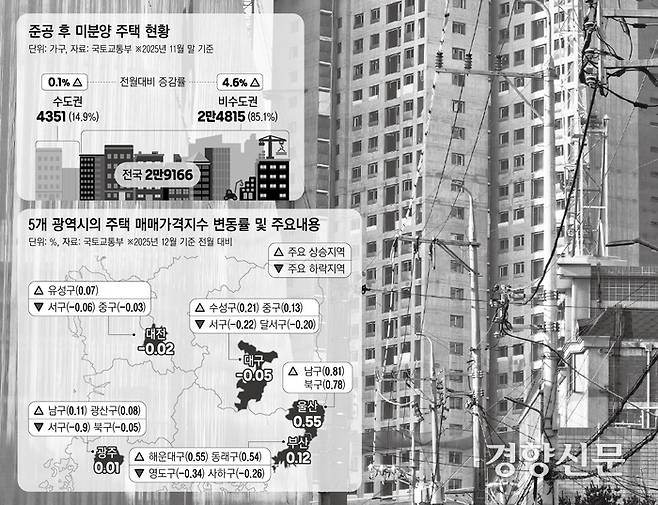 비수도권에서 준공 후 팔리지 않는 ‘악성’ 미분양 주택이 여전히 3만 가구에 육박하는 가운데, 서울에 거주하지 않는 사람들의 서울 주택 매수는 급증하며 시장 양극화는 한층 심화됐다. 정부는 비수도권 미분양 해소를 위해 분양 이후 집값이 떨어질 경우 되사주는 ‘주택 환매보증제도’ 등 지방 주택 수요 확충책을 내놨지만, 실제 효과를 놓고는 의문이 따른다.