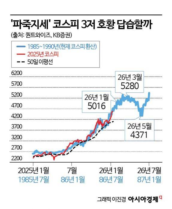 일각에선 현재 코스피 흐름이 1980년대 후반 '3저 호황' 당시와 유사하다는 분석도 나온다. 이은택 KB증권 연구원은 "앞으로도 유사한 흐름이 이어진다면 코스피 5000은 1월 말이면 도달이 가능하다"며 "다만 당시 주가 패턴을 그대로 답습한다면 2분기엔 급락이 나타날 수도 있다"고 말했다. 당시 코스피는 미 연방준비제도(Fed)가 1986년 8월을 마지막으로 금리 인하 사이클의 종료를 선언하면서 같은 해 10월까지 -17.6%에 이르는 조정을 겪은 바 있다.