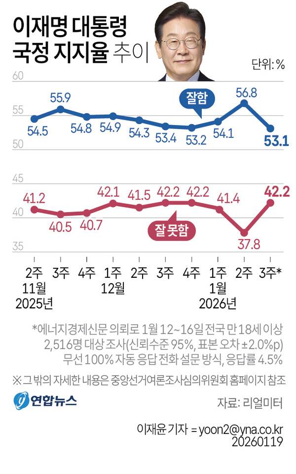 리얼미터가 에너지경제신문 의뢰로 지난 12∼16일 전국 18세 이상 2516명을 대상으로 조사한 결과 이 대통령의 국정수행을 긍정 평가한 응답자는 53.1%로 집계됐다. 지난주보다 3.7%포인트(p) 낮은 수치다.