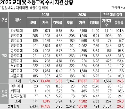 전국 10개 교대 및 3개 초등교육과는 2026학년도 정시모집에서 평균 3.71 대 1의 경쟁률을 기록하며 최근 5년 새 최고 경쟁률을 보였다. 지원자 수는 전년과 비교해 284명(증감률 5.3%)이 증가했고, 최근 5년 새 가장 적었던 2023학년도와 비교하면 1360명(31.8%)이 늘었다. 교대 중엔 춘천교대의 경쟁률이 4.61 대 1로 가장 높았고, 다음으로 광주교대 4.20 대 1, 대구교대 4.03 대 1, 공주교대 3.91 대 1 순으로 높게 나타났다. 초등교육과 중엔 한국교원대의 경쟁률이 6.51 대 1로 가장 높았다.