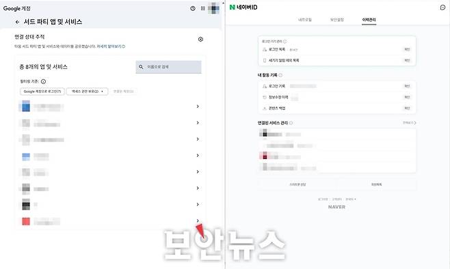 ▲구글과 네이버의 간편 로그인 조회 [출처: 보안뉴스]