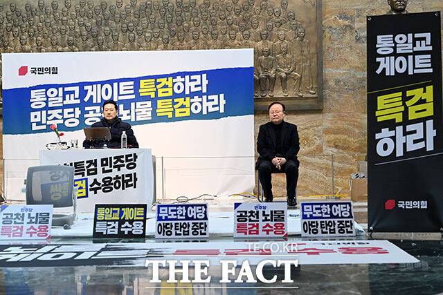 [더팩트ㅣ국회=남용희 기자] 김재원 국민의힘 최고위원(오른쪽)이 19일 오전 서울 여의도 국회 로텐더홀에서 장동혁 대표와 동조단식을 하고 있다.