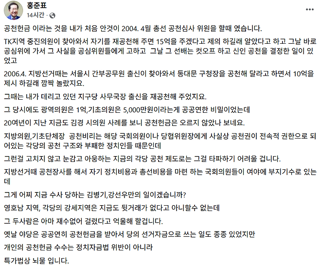 홍준표 전 대구시장이 최근 논란중인 민주당 공천헌금 관련해 본인도 과거에 '국회의원 희망자 15억원’, ‘구청장 희망자 10억원’을 제의받았던 경험담을 털어놨다.