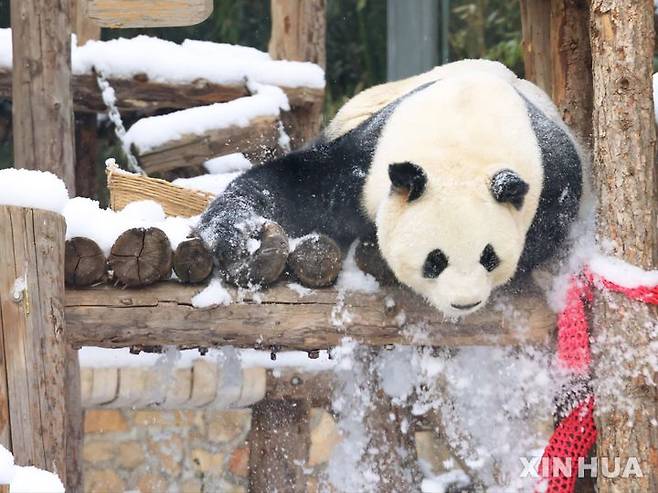 [베이징=신화/뉴시스] 18일(현지 시간) 중국 베이징에 눈이 내린 뒤 베이징동물원의 자이언트 판다가 눈 내린 우리에서 놀고 있다. 2026.01.19.