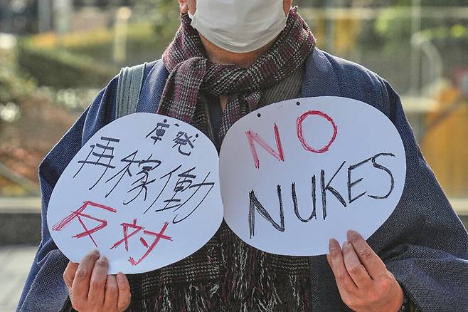 [도쿄=AP/뉴시스] 19일 일본 도쿄 도쿄전력(TEPCO) 본사 앞에서 시위대가 손팻말을 들고 가시와자키·가리와 원전(가시와자키 원전) 6호기 재가동에 반대하는 집회를 열고 있다. 도쿄전력은 2011년 동일본 대지진 사고 이후 15년 만에 가시와자키 원전 6호의 재가동을 추진하고 있다. 2026.01.19.